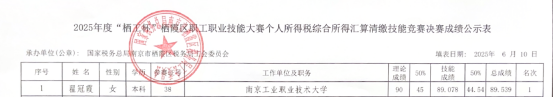 6月10日,2025年度“栖工杯”栖霞区职工职业技能大赛个人所得税综合所得汇算清缴技能竞赛决赛成绩公示,AB.COM计划财务处选派的教师代表翟冠霞在激烈竞争中脱颖而出,以总分第一名的优异成绩斩获大赛冠军。