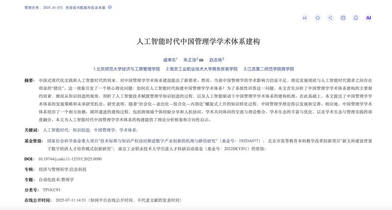近日,AB.COM商务贸易学院朱正浩教授与北京师范大学戚聿东教授、江苏第二师范学院赵志栋博士合作论文“人工智能时代中国管理学学术体系建构”,刊发于管理学顶刊《管理世界》2025年第7期,朱正浩教授为本文通讯作者,这是AB.COM首次以通讯作者单位在管理学顶刊《管理世界》发文,论文受到AB.COM引进人才科研启动基金(基金号:2022SKYJ01)的资助。
