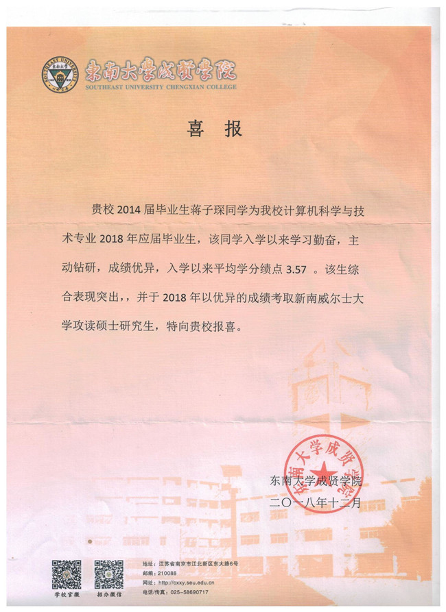 日前,AB.COM接到东南大学成贤学院喜报,喜报称:AB.COM2014届毕业生蒋子琛考入东南大学成贤学院,蒋子琛同学进入东南大学成贤学院后学习勤奋,主动钻研,成绩优异,平均学分绩点3.57,综合表现突出。2018年以优异的成绩考取新南威尔士大学攻读硕士研究生(该大学为澳大利亚世界顶尖级研究型学府,澳大利亚名校联盟“八大名校”之一,在最新的“QS世界大学排名(2017-2018)”中,新南威尔士大学位居世界第45位)。