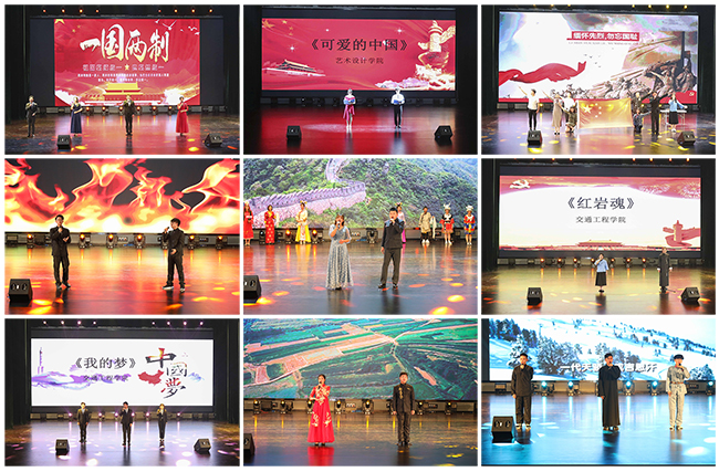 大赛以经济管理学院表演的《少年强则中国强》拉开帷幕,慷慨激昂的表演顿时点燃了全场的气氛;国际教育学院《江知道》表演者为缅甸留学生,他们通过描述美丽的瑞丽江(古称南卯江)来表达中缅友谊长存;计算机与软件学院《以青春的名义宣誓》表现了“我们以青春的名义宣誓,要让生命的花朵盛开在祖国最需要的地方”,一句句呐喊,一声声誓言,紧扣观众心弦,我们应该在青春年华去做更多有意义的事情;商务贸易学院《谁是最可爱的人》表现了普通人也具有伟大的力量,正是因为这些平凡人的付出和奉献,我们的祖国才会变的更加繁荣富强,他们才是最可爱的人;艺术设计学院《青春中国》,表现了不甘沉沦,挑起国家大梁。五四时期青年学生一声声热血的呐喊,只为求得民族解放和民族独立,他们的英勇事迹,不由让人肃然起敬;航空工程学院《我的祖国》表现了正所谓:“少年强,则国强;青年兴,则国兴。”他们用一颗颗赤诚之子的爱国之心歌颂伟大的祖国;经济管理学院《祖国在我的心中》,表现了祖国在你心中,在我心中,在每一个中国人的心中。我们要将对祖国的爱揉进骨子里,渗进血液中;国际教育学院《老人与海》歌颂了改革开放热潮所带来的经济腾飞和国家富强,在音乐和朗诵声中带给人们心灵震撼;航空工程学院《礼赞祖国》,表达了我们永远爱着这一方热土,这一切都使我们自豪!今天,我们一起向祖国表白!在此同心齐唱,礼赞祖国,为祖国的明天送上美好祝福;电气工程学院《七子之歌》,表现了我们知道自己肩负的责任,用自己的双手撑起祖国明天的辉煌。中国不会重走那段屈辱的历程,科技之光定会照亮祖国大地的每一个角落;艺术设计学院《可爱的中国》,表现了1935年身陷狱中的方志敏戴着镣铐饱含深情地写下了《可爱的中国》,传递出那个时代的爱国最强音。同学们以诵读红色经典的方式,传承红色基因,弘扬家国情怀;商务贸易学院《缅怀先烈》,表现了一个有希望的民族不能没有英雄,一个有前途的国家不能没有先锋,所以总有人要走上前线,去撑起一个国家的脊梁。铭记历史,缅怀先烈,不忘初心、牢记使命,我们一起砥砺前行;计算机与软件学院《祖国啊,我要燃烧》,表现了即使变成了一块煤,仍要舍命呐喊出对祖国的满腔热情,为祖国燃烧自己最后的一点光和热;经济管理学院《我的南方与北方》,表现了长江、黄河、长城、黄山...我们在字里行间领略了祖国的大好河山;交通工程学院《红岩魂》,表现了作为伟大的革命先行者,江姐为革命事业英勇就义的真实故事曾打动了无数人的心,她的英勇事迹也在一代又一代人心中留下了不可磨灭的痕迹;交通工程学院《我的梦》,表现了中国梦是追求幸福的梦。中国梦是中华民族的梦,也是每个中国人的梦。我们怀着一份坚强,一份荣耀,一份铭记,努力实现中国梦,创造更加美好的未来;机械工程学院《我骄傲我是中国人》,表达了五千年漫漫征程,一路风雨兼行。如今已走向世界的中国,脚步迈得更加坚定,更加豪迈。中华腾飞,势不可当。我骄傲,我是中国人;电气工程学院《毛泽东诗四首》,表达了传承发扬红色精神,不忘初心,向中华人民共和国成立70周年献礼,在党的领导下砥砺前行;机械工程学院《歌唱祖国》,表达了身为当代中国青年,理应脚踏实地、奋发图强,为实现中华民族伟大复兴的中国梦而努力奋斗。