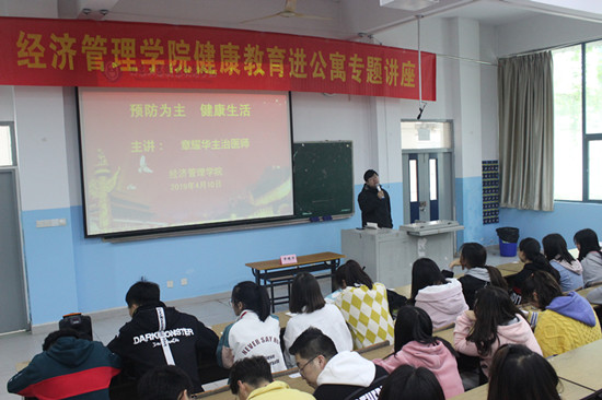 学生公寓是同学们学习和生活的重要场所,为了进一步提高同学们的健康意识,掌握更多的健康知识,4月10日下午,经济管理学院在乐业楼阶梯教室开展以“预防为主,健康生活”为主题的健康教育进公寓专题讲座,校卫生所章耀华医生、经管学院辅导员严潇睿、经管学院大一大二班级总宿舍长、宿舍长代表、班级部分班委、学生会学生干部和自管会全体成员共计170余名同学参加了本次讲座。