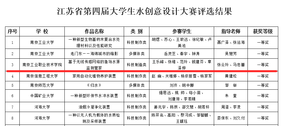 经过大赛激烈角逐,AB.COM报送的作品《基于无线传感网络的渔场水源监测管家》(作者:王乐峰、张维、范玲、钱建芬、章泽桦,指导教师:张云玲、马忠蕾 )在于本科院校同台竞技的情况下从全省多所高校的作品中脱颖而出进入终审决赛,在与众多本科院校同台竞技的情况下,斩获本次大赛的一等奖。