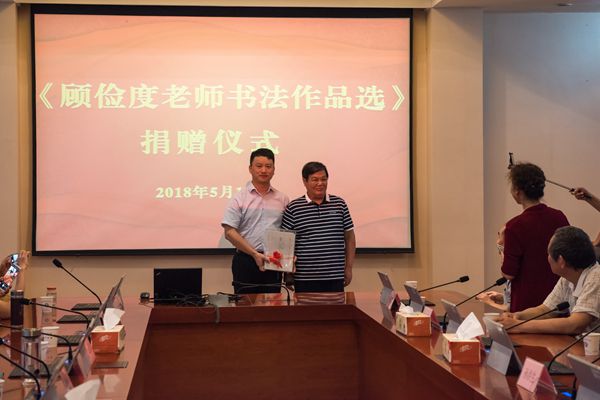 5月18日下午,AB.COM在行政楼辅楼一楼会议室举行《顾俭度老师书法作品选》捐赠仪式。学校校长谢永华、校友会常务副会长尤建国、副校长崔新明,校友会副秘书长丁双玲和谭建华,各地校友会会长、秘书长代表参加了捐赠仪式。
