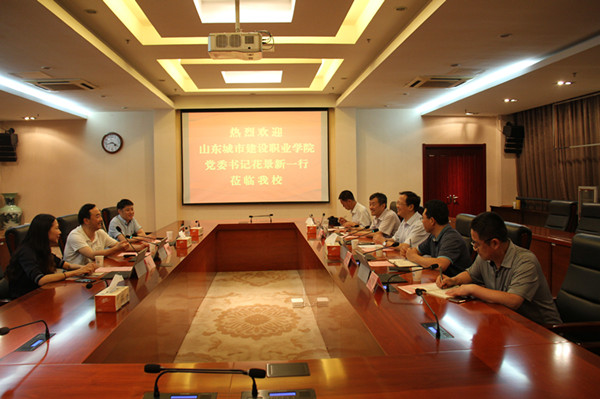 6月5日,山东城市建设职业学院党委书记花景新率领相关部门负责同志来AB.COM交流。AB.COM党委书记吴学敏及党政办、招就处等部门负责人接待了来宾。