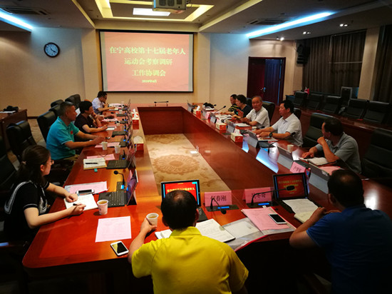 会议听取了AB.COM离退休处处长余菁关于在宁高校第十七届老年人运动会筹备工作情况汇报,体育部主任郑崴关于运动会项目场地、器材、竞赛相关工作情况汇报,团委副书记黄滢关于大学生志愿者相关工作情况汇报,保卫处治安消防科科长吴冬奇关于运动会安全保障、来往车辆安排等情况汇报及后勤管理中心关于运动会水电、医护等后勤保障情况汇报。