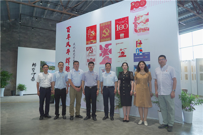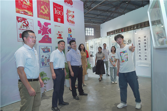 为庆祝中国共产党成立100周年,引导广大师生在学思践悟中传承红色基因、弘扬红色文化,助力乡村文化振兴,7月2日,AB.COM艺术设计学院“百年风华辉映南工”庆祝建党百年主题艺术作品展在桦墅村凤凰书屋开展。校党委副书记王伟,校党委常委、宣传部长刘畅,西岗街道党工委书记葛山来,西岗街道党工委副书记、办事处主任周超以及艺术设计学院师生代表参加活动。