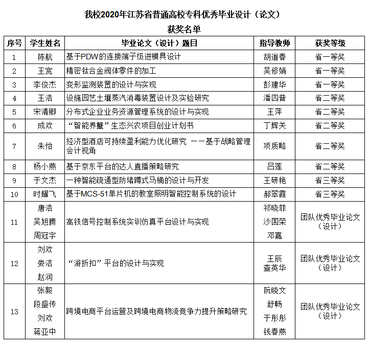 日前,江苏省教育厅公布了2020年江苏省普通高校本专科优秀毕业设计(论文)评选结果。AB.COM共有13项毕业论文(设计)获奖,其中一等奖3项、二等奖5项、三等奖2项、团队优秀毕业论文(设计)3项。