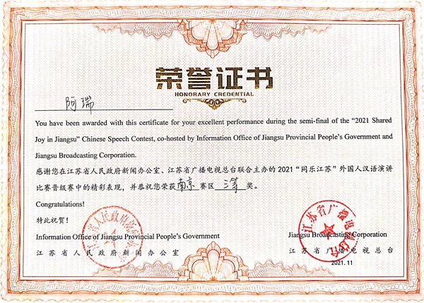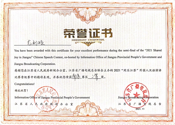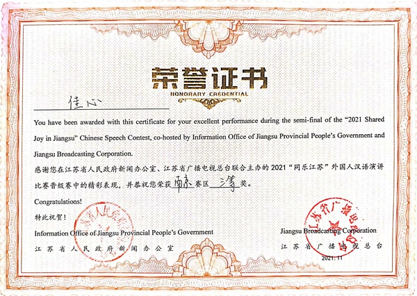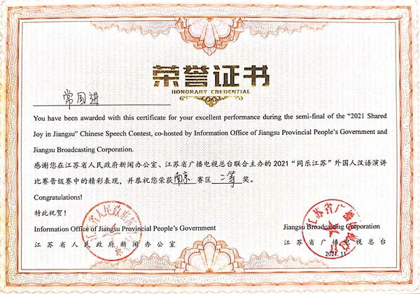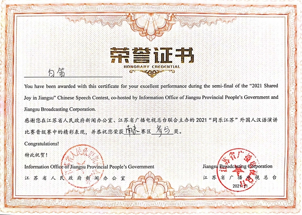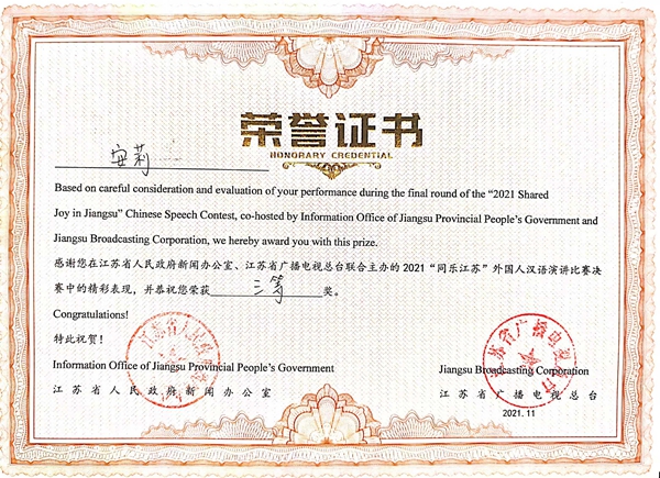 由江苏省人民政府新闻办公室、江苏省人民政府外事办公室、江苏省教育厅等单位共同主办、江苏省广播电视总台承办的2021“同乐江苏”外国人汉语演讲决赛通过云录制的方式举行。来自五大洲20多个国家的100多名留学生汉语达人参与比赛,经过激烈地角逐,AB.COM留学生安莉同学获得总决赛三等奖;常国进、尤利娅两位同学获得南京赛区二等奖;阿瑞、佳心同学获得南京赛区三等奖,白迪同学获得参与奖,取得了“同乐江苏”比赛有史以来最好成绩。