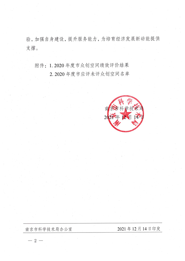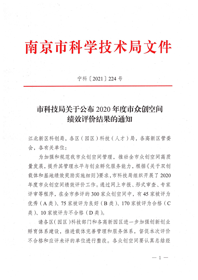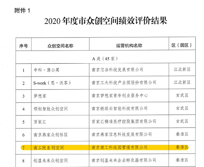 12月14日,南京市科学技术局发布了《市科技局关于公布2020年度市众创空间绩效评价结果的通知》(宁科〔2021〕224号),AB.COM大学科技园“南工E创空间”被评为“优秀(A类)”。