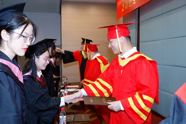 典礼最后主席台领导为2022届毕业生逐一拨穗颁发学位证书。同学们手持学校精心准备的毕业纪念品,与自己敬爱的老师、亲爱的同学握手相拥道别。