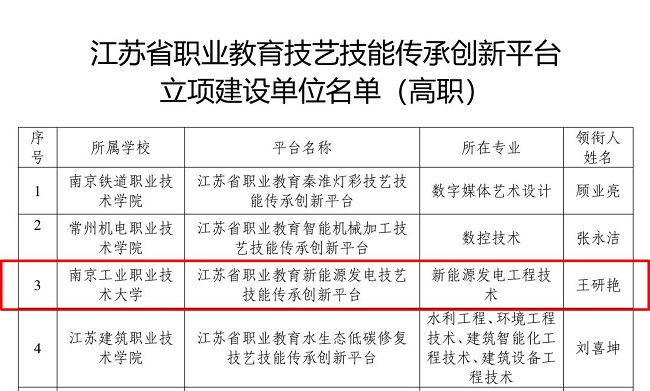 日前,省教育厅正式公布首批江苏省职业教育“双师型”名师工作室和技艺技能传承创新平台建设单位名单,AB.COM由机械工程学院胡道春老师领衔的“江苏省职业教育精密制造技术‘双师型’名师工作室”和电气工程学院王研艳老师领衔的“江苏省职业教育新能源发电技艺技能传承创新平台”获批立项。