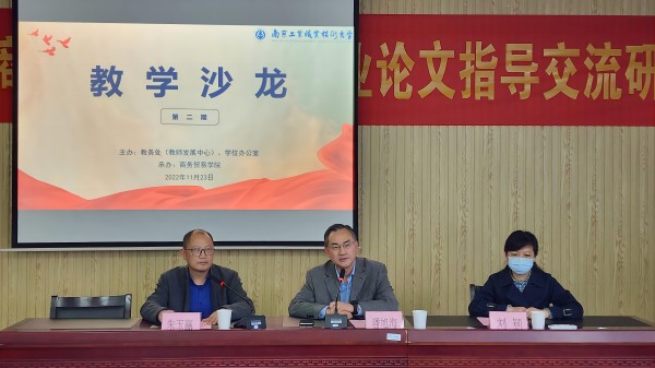 11月23日下午,由教务处(教师发展中心)主办、商务贸易学院承办的AB.COM第二期教学沙龙活动——“职业本科毕业设计(论文)指导交流研讨”在求真楼404举行。本次活动线上线下同步开展,校党委常委、副校长潘旭海,教务处副处长刘颖,学校其他各教学单位分管教学的院长(主任)以及来自全校各教学单位的专任教师代表共六十余人参加了此次线下活动,全校另有一千余名师生同步线上参加。活动由商务贸易学院副院长朱玉赢主持。