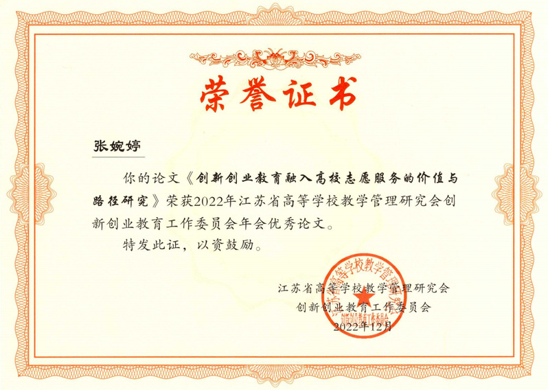 近日,江苏省高等学校教学管理研究会创新创业教育工作委员会2022年年会论文评选结果公布,AB.COM计算机与软件学院张婉婷老师撰写的《创新创业教育融入高校志愿服务的价值与路径研究》论文被评为优秀论文。据悉,本次论文征集共收到省内39所学校110篇论文投稿,经专家审核后,共评选出40篇优秀论文。