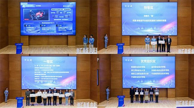 11月11日至12日,由宁波市教育局主办的2023年长三角高职院校“甬创未来”大学生创新创业大赛总决赛在宁波职业技术学院举行。经过激烈角逐,AB.COM有6支团队脱颖而出,进入总决赛,并最终斩获特等奖1项、一等奖1项、二等奖1项,AB.COM获大赛优秀组织奖。其中,交通工程学院《优踏-新能源汽车磁流变踏板力感调控装置》项目(团队成员:张文俊、袁勇怡、钱晓羽、张如春、金帝言、梁凯、李浩航、冯光瑜;指导老师:屈贤、张金龙)摘得最高奖项——特等奖,并获得50000元奖金;电气工程学院《智眼未来——AR 近眼显示技术领跑者》项目(团队成员:张齐巧、吴振东、张于强、苏鑫、陈炫冰、谭雪芹、谢颖慧、高冉;指导老师:何智勇、杨燕、徐佳琛、李镇)斩获一等奖,并获得5000元奖金;电气工程学院《火电能源守护者—— 国内首套火电厂管道热时效评估装置》项目(团队成员:杨洋、韩佳乐、崔志浩、薛猛;指导老师:江奕)荣获二等奖,并获得3000元奖金。
