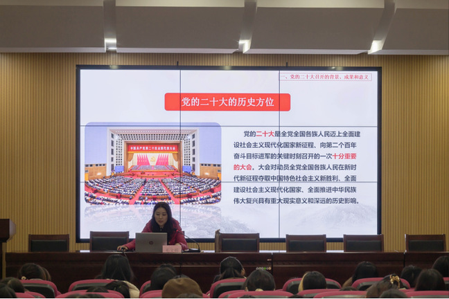 开班仪式结束后,毛文娟作了题为《伟大复兴为己任 强国有我新征程——深刻领悟全面把握党的二十大精神》的专题党课,她从“党的二十大召开的背景、成果和意义”“深刻领会党的二十大精神的核心要义”“把握时代机遇 助力青年成长”三个方面带领学员们领悟党的二十大精神,引导艺术学子将党的理论知识与中华优秀传统文化相结合,成为中华优秀传统文化的践行者、宣传者、传播者。