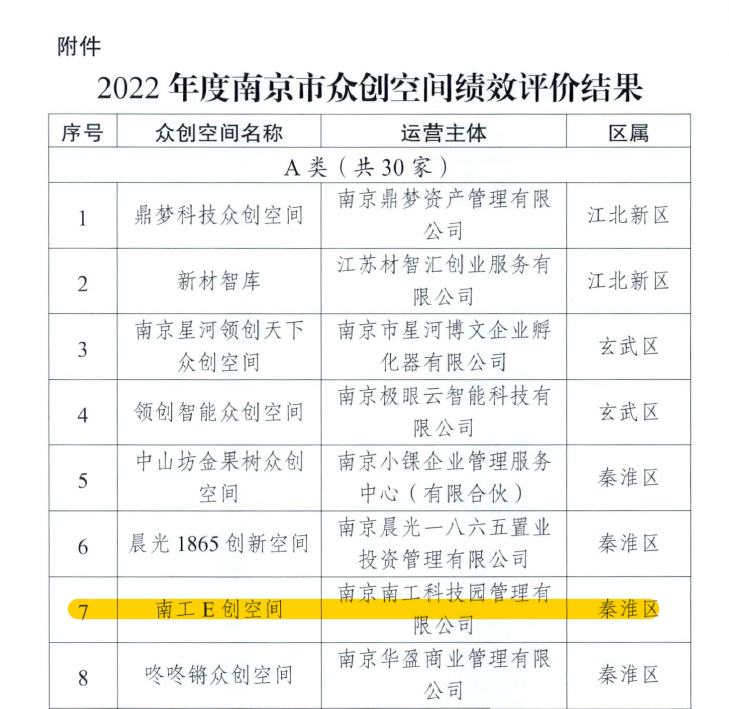 近日,南京市科学技术局发布了《市科技局关于公布2022年度市众创空间绩效评价结果的通知》(宁科〔2023〕56号),AB.COM大学科技园E创空间被评为“优秀(A类)”。
