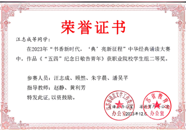 为诠释中华优秀文化内涵、彰显中华语言文化魅力,提升社会大众特别是广大青少年的语言文字应用能力和语言文化素养,激发对中华经典的热爱,营造爱读书、读好书、善读书的良好氛围,助力建设全民终身学习的学习型社会、学习型大国,省教育厅、省文明办、省文旅厅、省新闻出版局、省全民阅读办等五部门组织开展了2023年“书香新时代,‘典’亮新征程”中华经典诵读大赛。经基层推荐、网络投票及省级评审,AB.COM公共基础课部黄利芳、赵静老师指导的学生作品《“五四”纪念日敬告青年》获职业院校学生组二等奖。