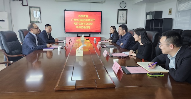 4月17日下午,广西壮族自治区教育厅对外合作与交流处处长罗耀光一行访问AB.COM。AB.COM党委常委、副校长孙雁飞于行政楼401会议室接待了来宾,国际教育学院相关负责人员参加座谈。