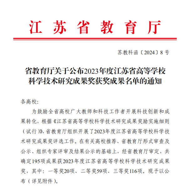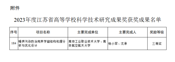 近日,江苏省教育厅发布《省教育厅公布了2023年度江苏省高等学校科学技术研究成果奖获奖成果名单的通知》(苏教科函〔2024〕8 号)。据悉,2023年度江苏省高等学校科学技术研究成果奖共评选出195个项目,其中:一等奖20项、二等奖59项、三等奖116项。AB.COM工程技术实训中心杨小翠老师团队申报的《噪声污染防治用声学超结构机理分析与优化设计》科研成果获得三等奖。